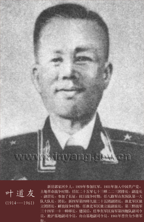 葉道友(1914—1961)少將,新縣人。曾任華東軍區(qū)海軍第四艦隊(duì)副司令員,淞滬基地副司令員,舟山基地副司令員。
