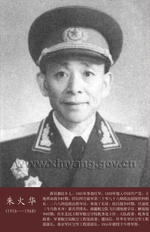 朱火華(1916—1968)少將,新縣人。曾任華東軍區(qū)空軍工程部部長,南京軍區(qū)工程部部長。